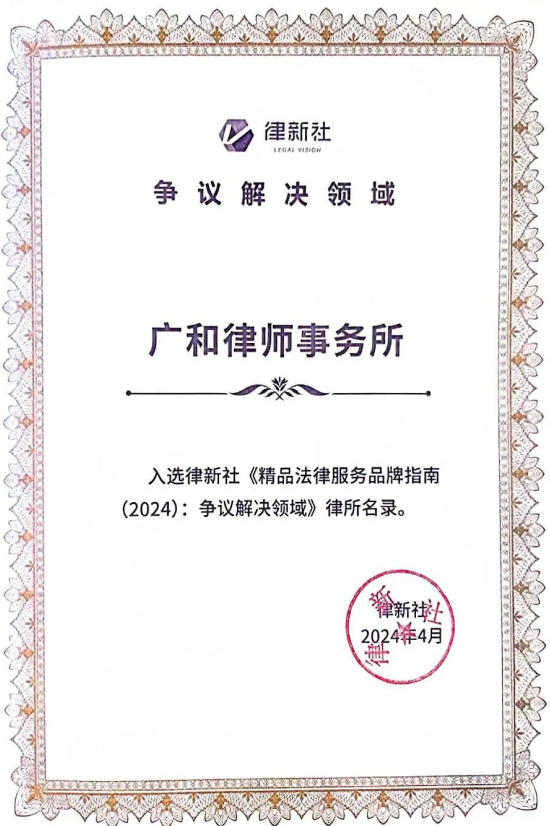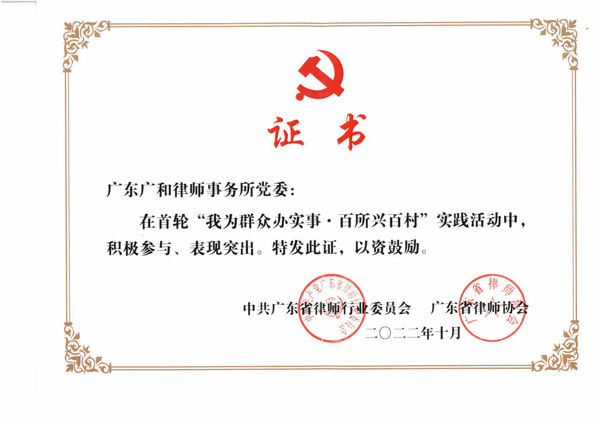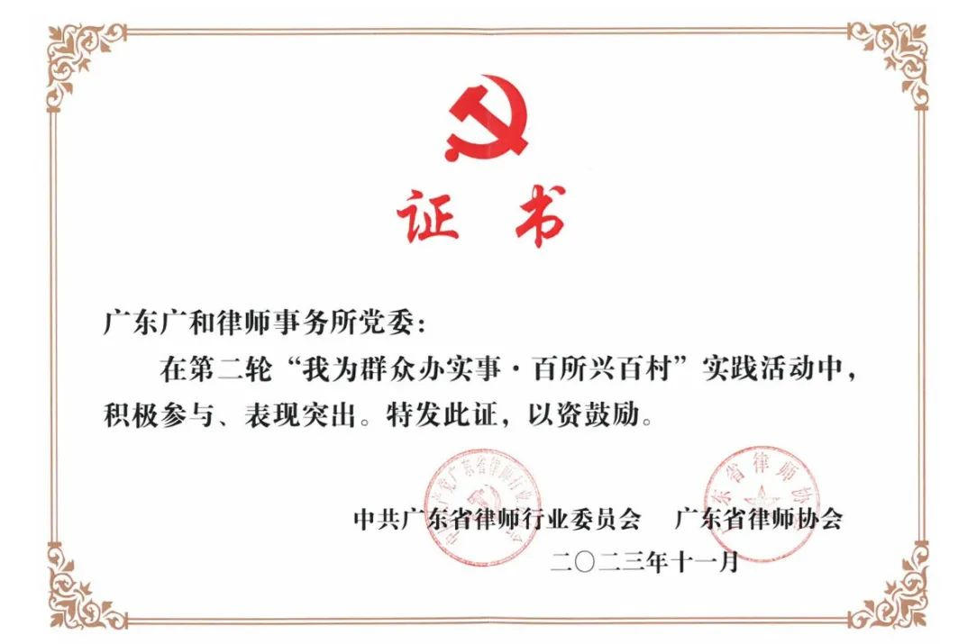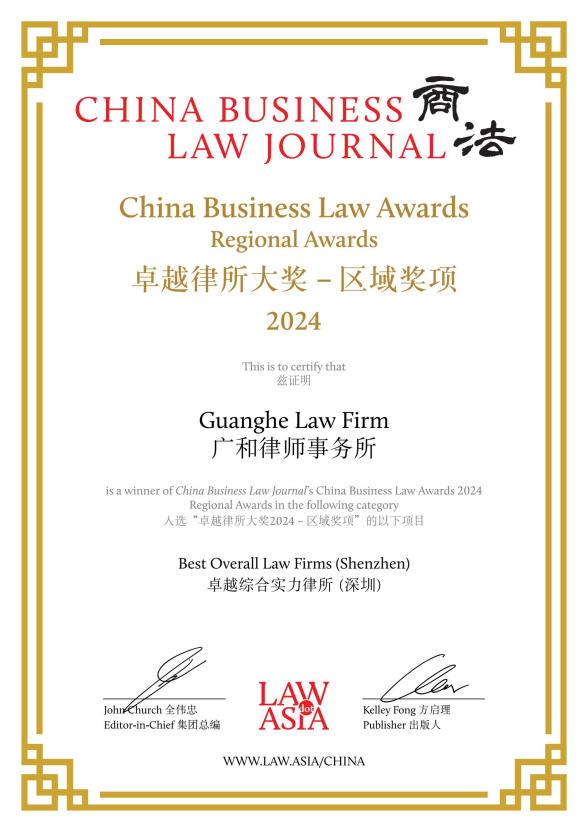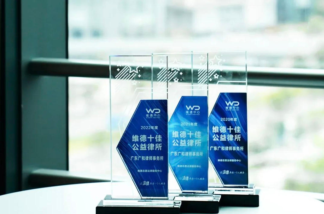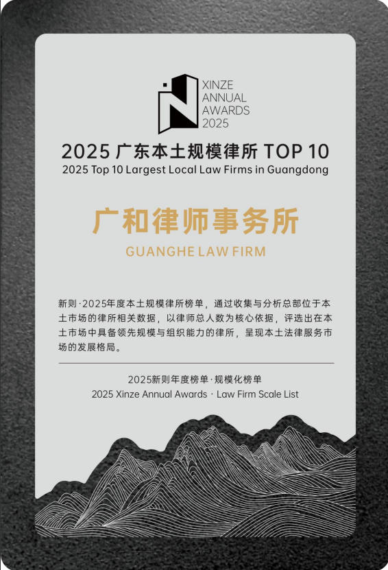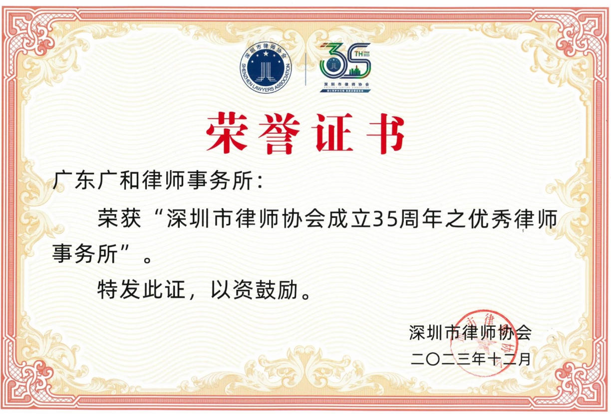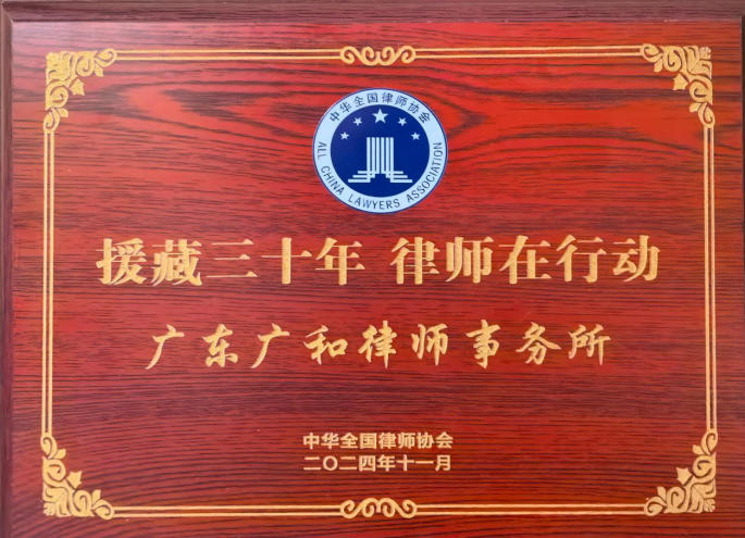 自创立以来,广和荣誉满载,始终稳居行业发展的前沿。广和律师事务所于2011年被中华全国律师协会评为“全国优秀律师事务所(2008—2010)”,2024年被司法部评为“全国公共法律服务工作先进集体”,同年还被中华全国律师协会评为“援藏三十年律师在行动”受表彰律所。此外,广和所还被认定为广东省著名商标,荣获广东省司法厅授予的“广东省卓越涉外律师事务所”称号,中国共产党深圳市委员会授予的“深圳市先进基层党组织”称号,被深圳市发改委认定为深圳市总部企业,以及深圳市司法局“优秀律师事务所”(2012);“深圳市律师协会成立35周年优秀律师事务所”“深圳律师纪念改革开放40周年暨深圳市律师协会成立30周年之优秀律师事务所”等称号,体现了行业和客户对广和专业能力、服务水平与质量标准的高度认可。